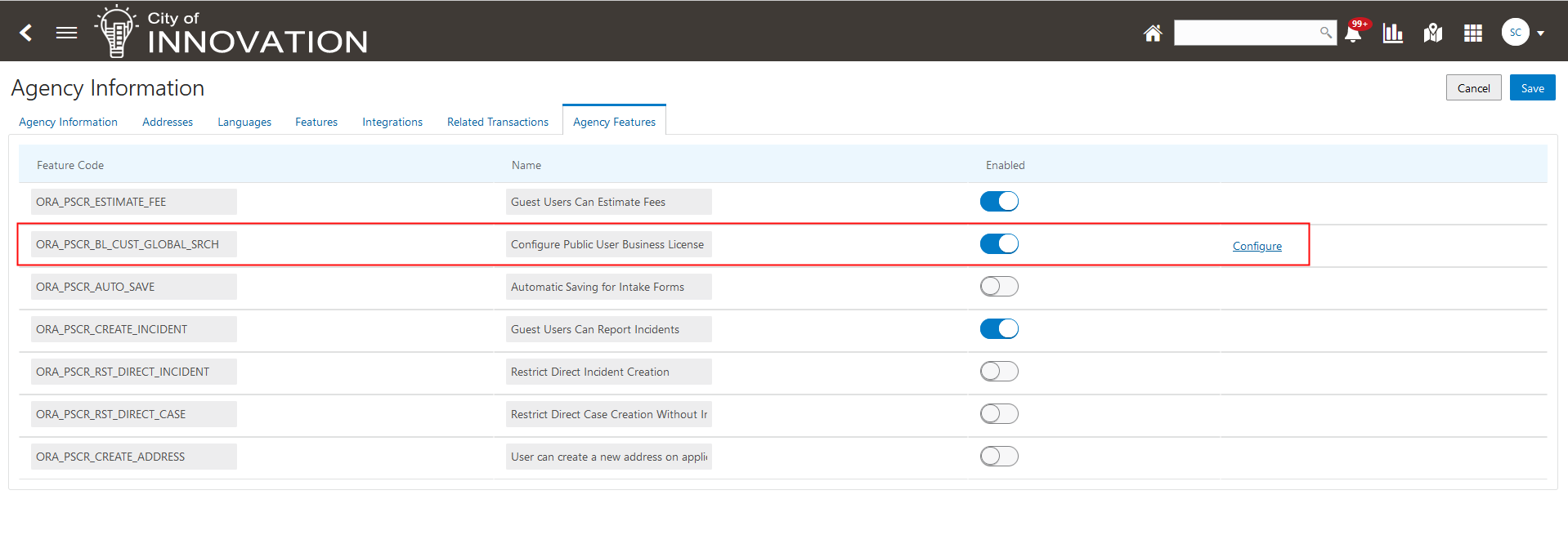 This example illustrates the Agency Information page where the feature code for configuring the business license search is available.