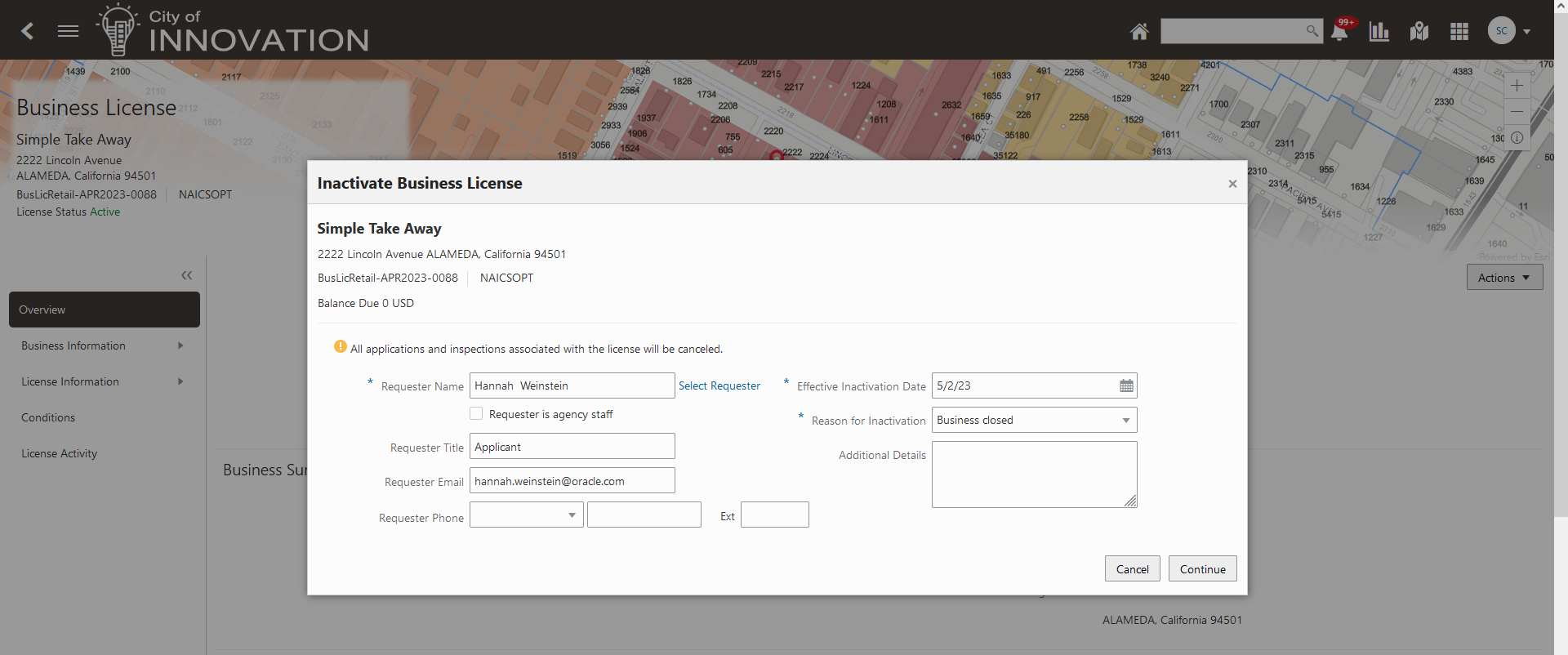 Registered public users such as the business owner, applicant, and contacts, with appropriate permissions, can request to inactivate their business license, which will be reviewed and approved by the agency staff.