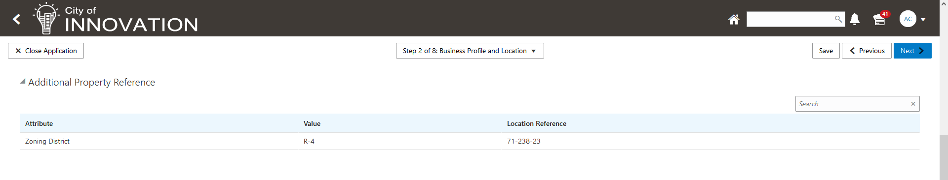 This example illustrates the Additional Property Reference grid after an applicant selects a property location in an application.