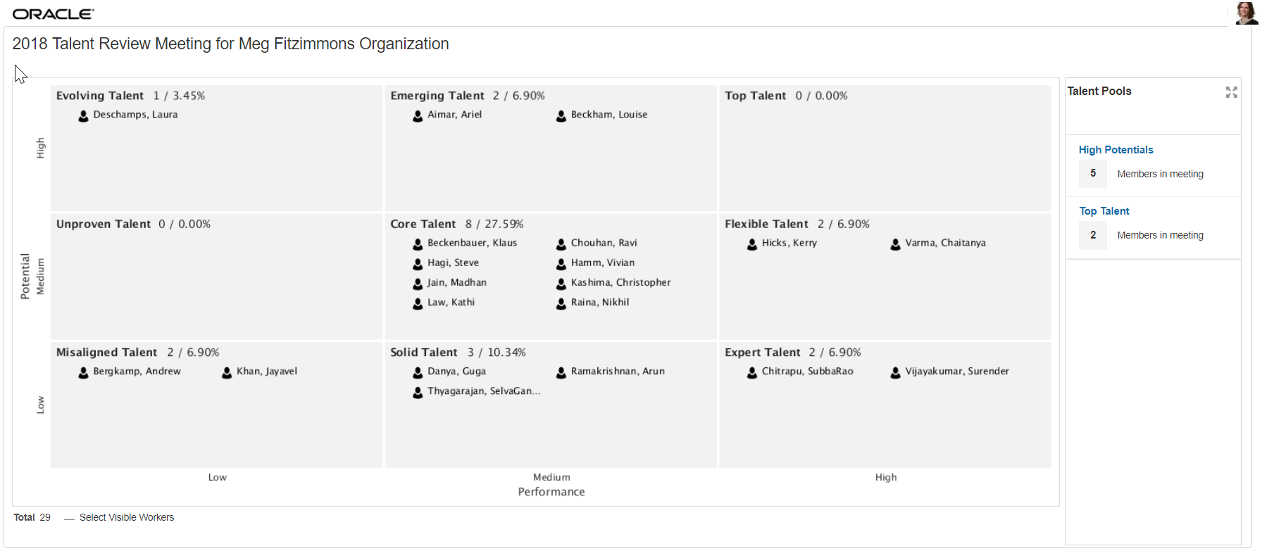 Oracle Talent Review is an analytic product enabling your organization to review and evaluate data from the profile, performance, goals, career development, and compensation management solutions.