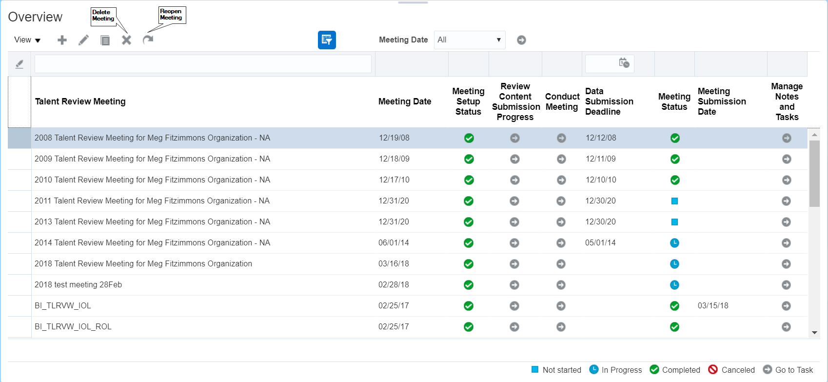 Using HCM Data Loader, you can create a new meeting only with the meeting configuration status as Draft and meeting status as Not started. If you do not specify the meeting status during upload, the meeting status defaults to Not started.
