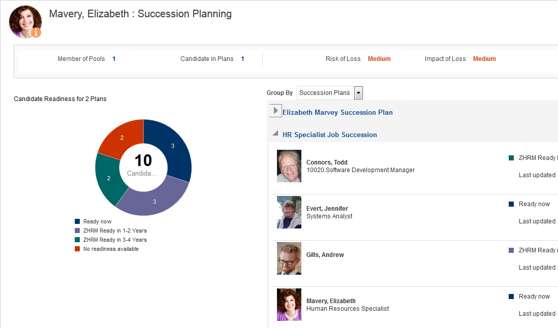 The Succession Planning page in person spotlight for a selected direct report now lists only the plans for which you have automatic succession plan view access or for which you are a named owner. You can also view the candidate count and information for each succession plan. The sunburst shows only the candidates for whom you have view succession data security access.