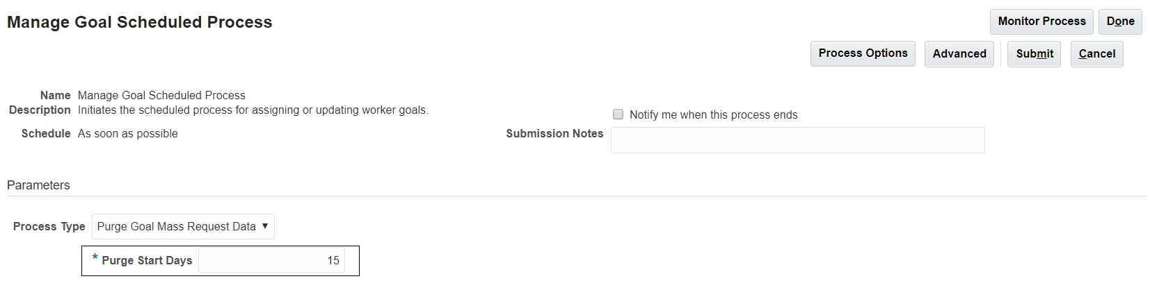 Depending on the frequency you run the Goal processes such as Mass Assign Goals, Assign Goal Plans, or Assign Goal Plan Sets, data accumulates in database storage and slows down the application. So, you can schedule the Purge Goal Mass Request Data process accordingly and purge the data.