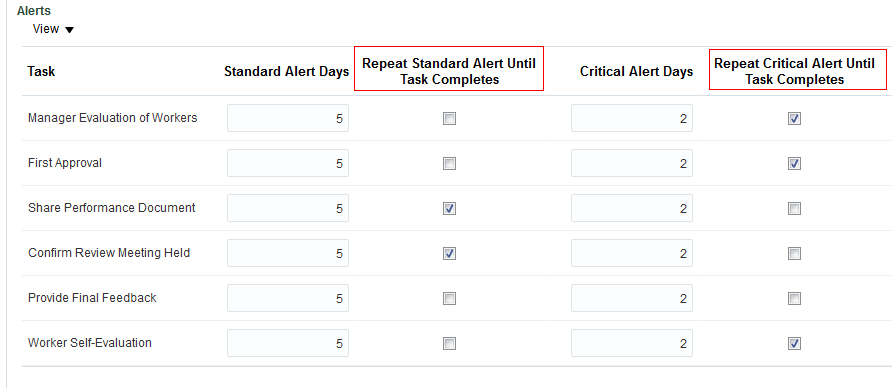 You can improve employee completion of performance evaluation tasks by resending standard and critical alert notifications, even after the task due date has passed. Select the tasks for which you want to enable repeat alerts in the performance template. Then enable the alerts only when required to avoid excessive notifications. Alerts will not be sent to employees who have completed the task.