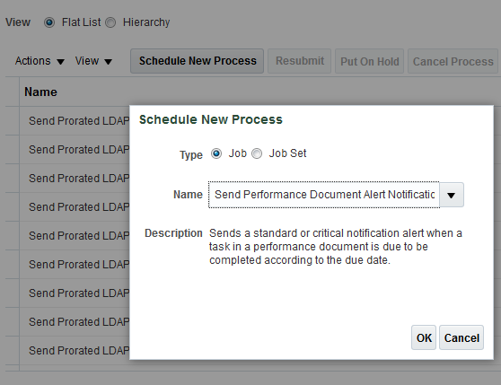 To set up the notifications, you select the notifications in the performance template. On the Process tab, select either, or both, the Repeat Standard Alert Until Task Completes and Repeat Critical Alert Until Task Completes check boxes. Then you must run an Oracle Enterprise Scheduler Service process to send the notifications. Use the Send Performance Document Alert Notifications job to send the notifications, and set the schedule as appropriate for your business processes.
