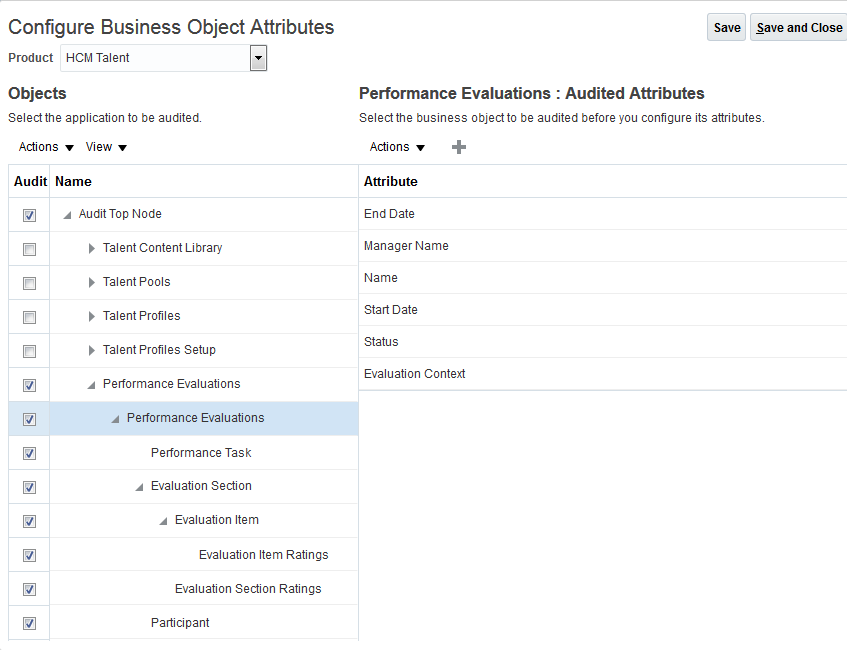 - Select the business objects you want to audit for performance evaluations, such as Performance Task, Evaluation Section, and so on.