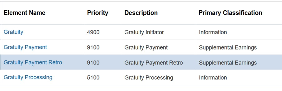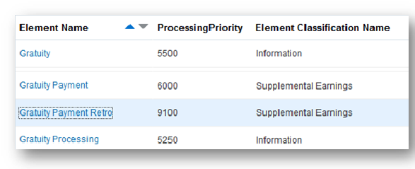 For example, an employee with 30th April as the termination date may have an agreement that the final payment will be made later, for example 4th May. In order to pay gratuity at the agreed date, the retro process will first verify that the gratuity payment element has not been processed, and then generate the gratuity payment retro element with the appropriate details for the correct payment.