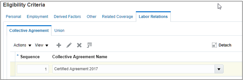 You can now determine benefits eligibility using unions and collective agreement information. There is now a new tab called Labor Relations that contains these new eligibility criteria.