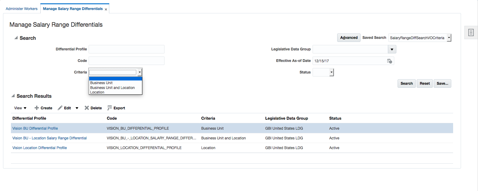 We added additional criteria to the Manage Salary Range Differentials task.You can now configure the salary range differential profile by location, business unit, or business unit and location. Previously, location was the only criteria available.