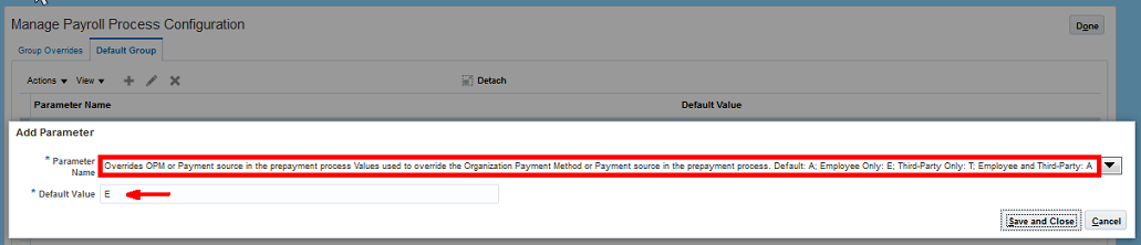 To use this feature, add the 'Overrides OPM or Payment Source in the Prepayment Process' action parameter and set the override value in the Manage Payroll Process Configuration UI.
