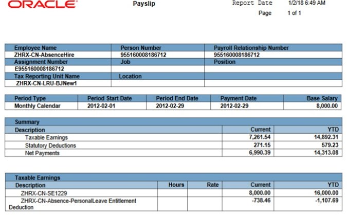 Negative leave payment can also be made when an employee is on unpaid leave and long-term sick leave. To show a positive deduction amount, you may create a pretax non-statutory deduction element, feed the net pay to the element, and turn the negative amount to positive with a formula.