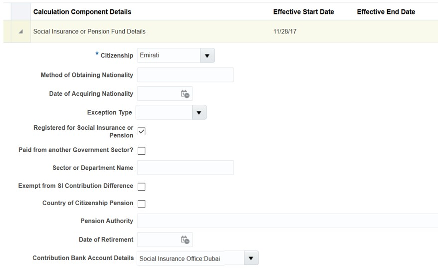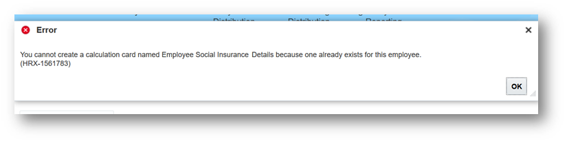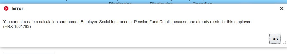 To assure data validity, employee social insurance or pension fund details calculation cards cannot be duplicated in the UAE. An error message is generated if an attempt is made to manually create a duplicate social insurance or pension fund details calculation card.