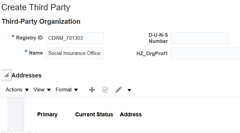 A third party organization must be created for each social insurance office as an external payee, and the relevant third party must be associated with the social insurance or pension fund details component of the social insurance or pension fund details calculation card, for each employee.