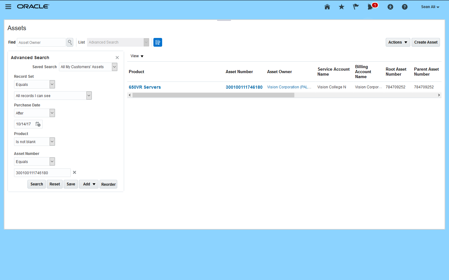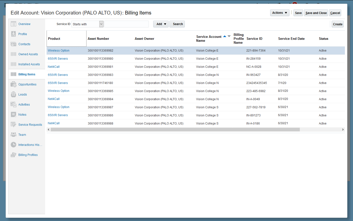 You can also view assets across all accounts in the top-level asset landing page of the application. On this page, you can search assets for specific asset attribute values, such as Asset Number, Status, Service ID, and Service End Date, and so on.