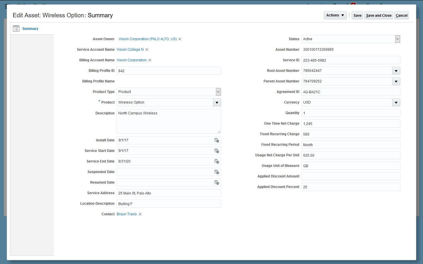 As a sales or service agent, you can associate a contact to the asset, for example, when you want to refer a person to be contacted for any service issues related to the asset. You can also edit the location description of the asset to make it easier to locate at times of service. Other fields are generally setup as read-only for sales and service agents, as they are generated via fulfilled orders to create or modify the subscription service.
