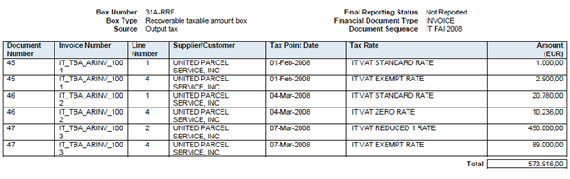 This report supports the summary billing requirement. Based on the business process, companies are required to print and send an AR tax invoice to their customers for all output VAT transactions. When the customer has requested Summary Billing, they can request for several Receivables invoices to be combined into a single AR Tax Invoice to be printed in the specific invoice layout format. The report is used to generate the tax invoice for Summary Billing cases. This is done at the end of the month. The summary of all supplies along with invoice value and tax value is listed.