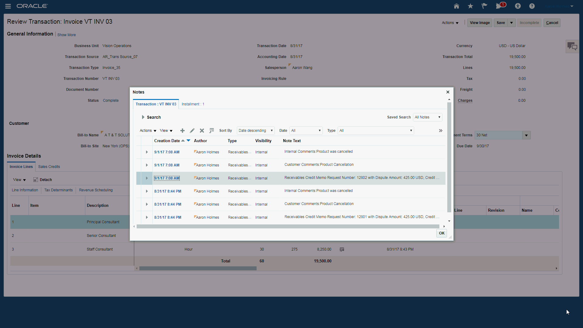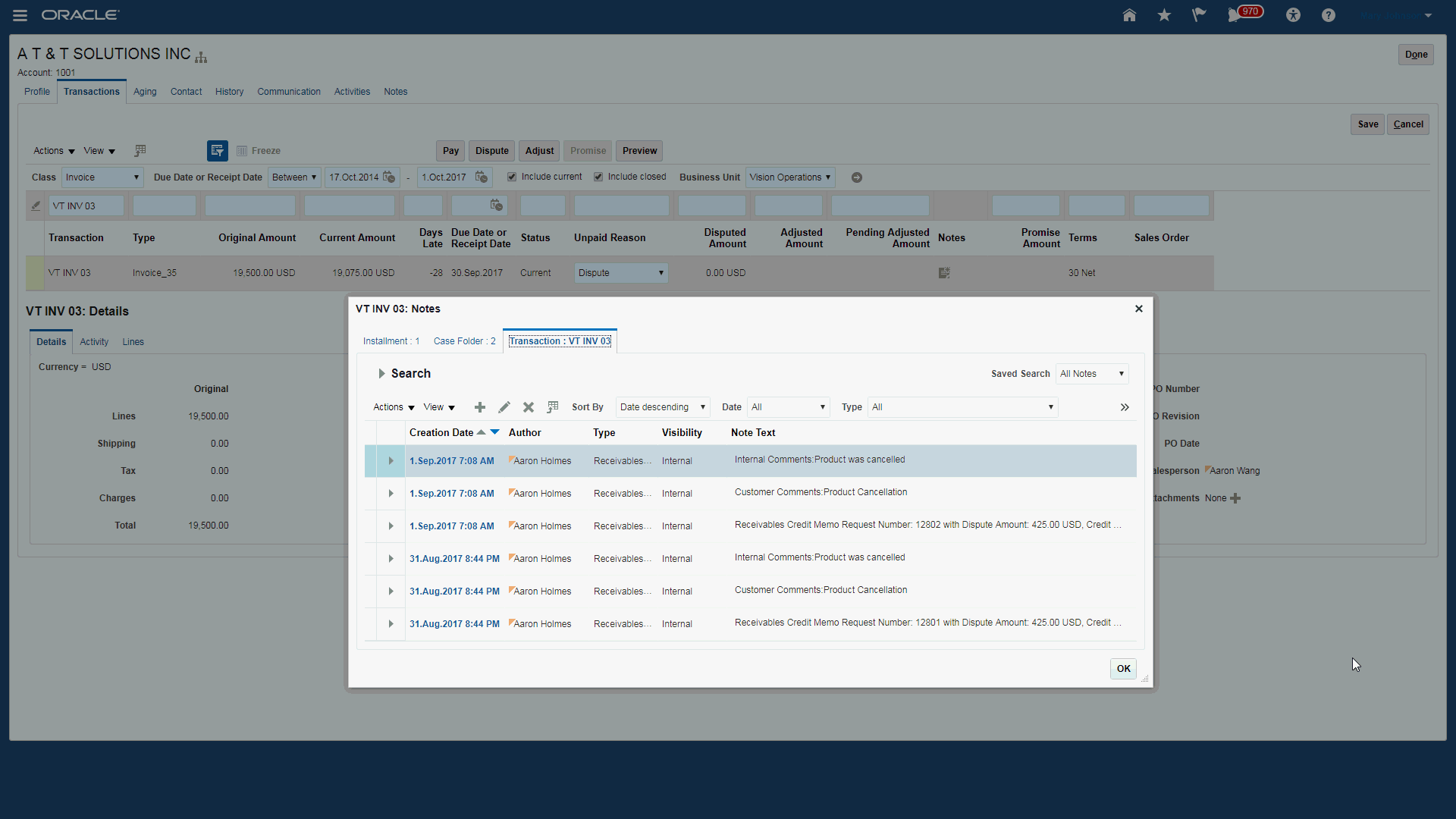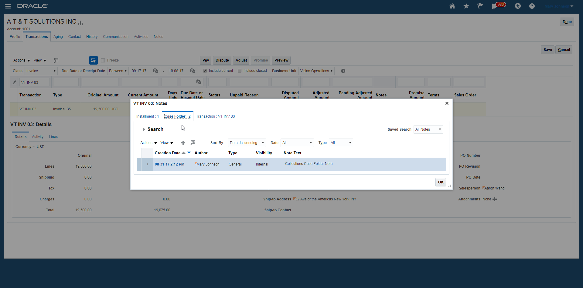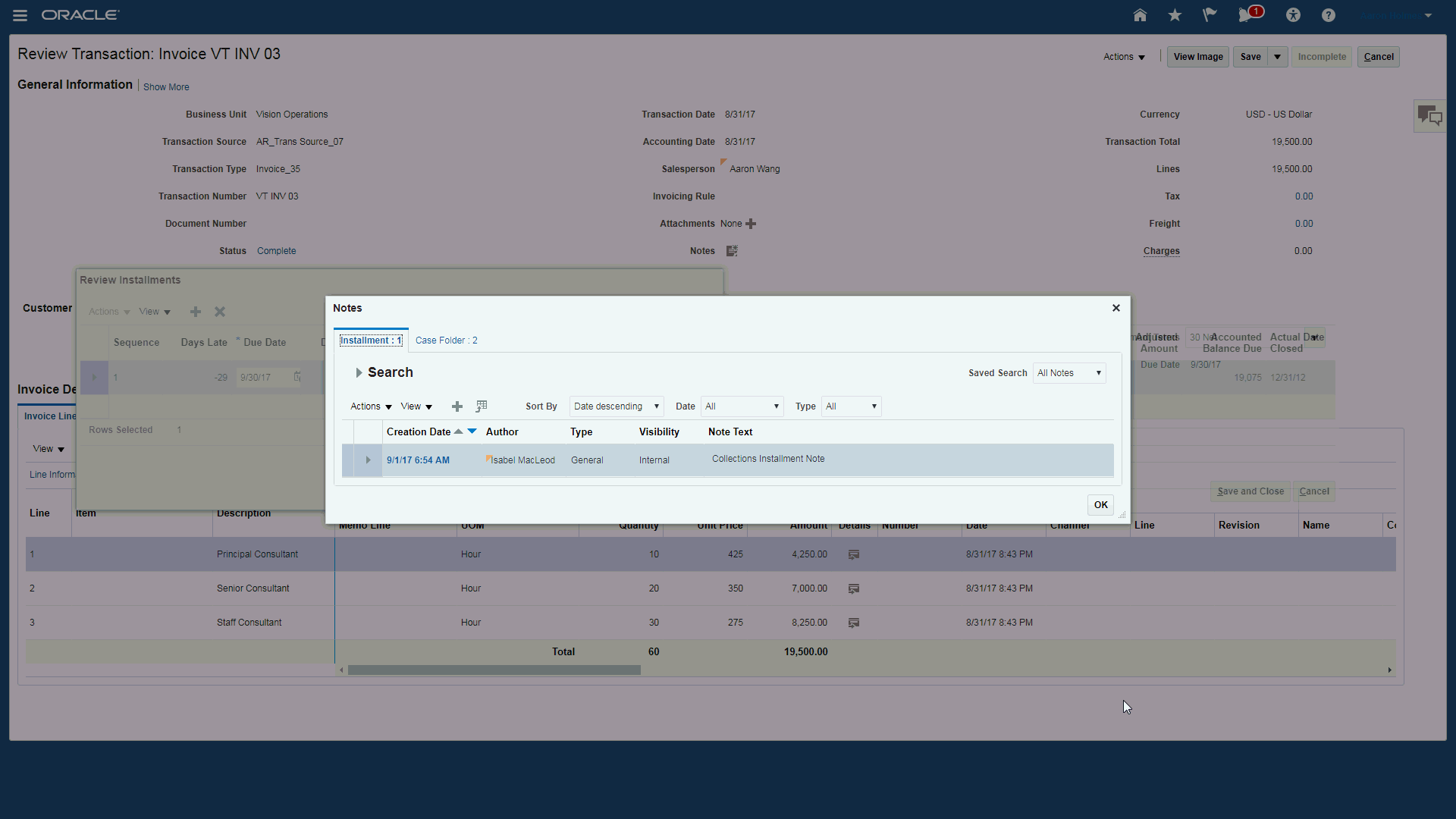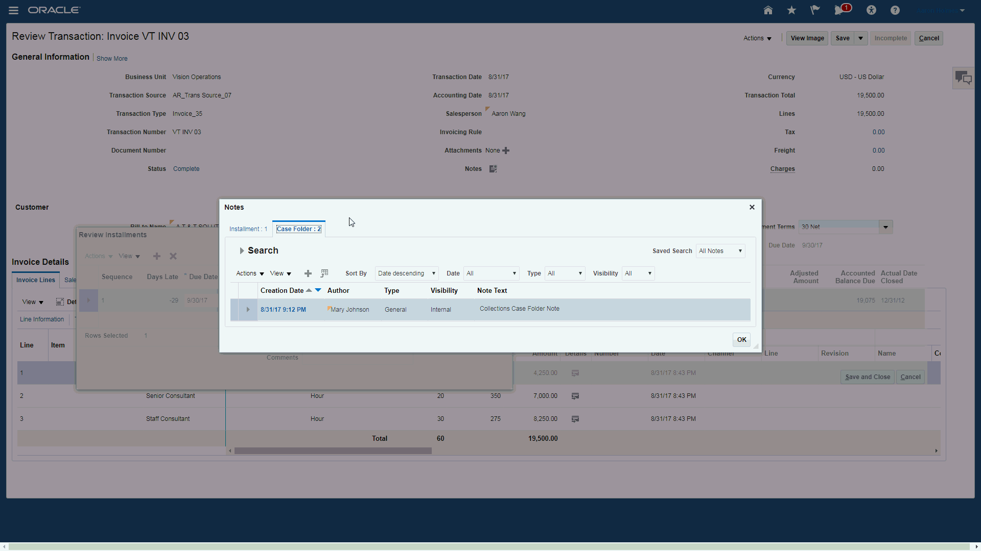 In Collections, the user can query a transaction installment for a customer and review the notes created for the Receivables transaction.