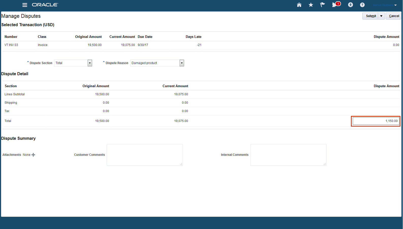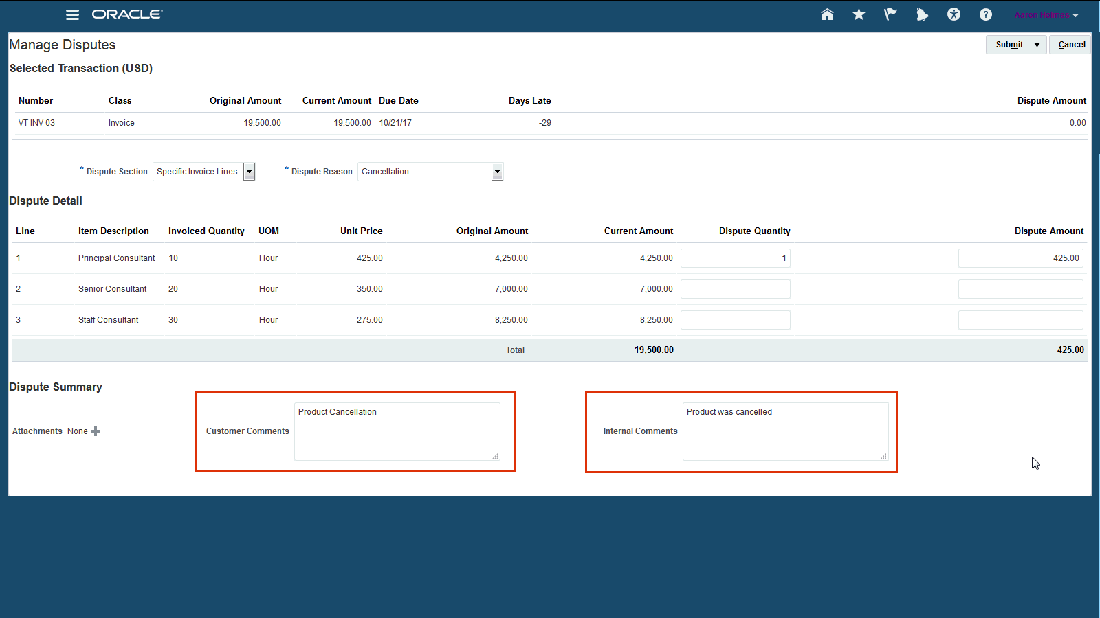 Receivables and Collections users can now enter internal comments and customer comments both when creating a dispute and tracking the dispute across related transactions. The enhanced dispute functionality includes: