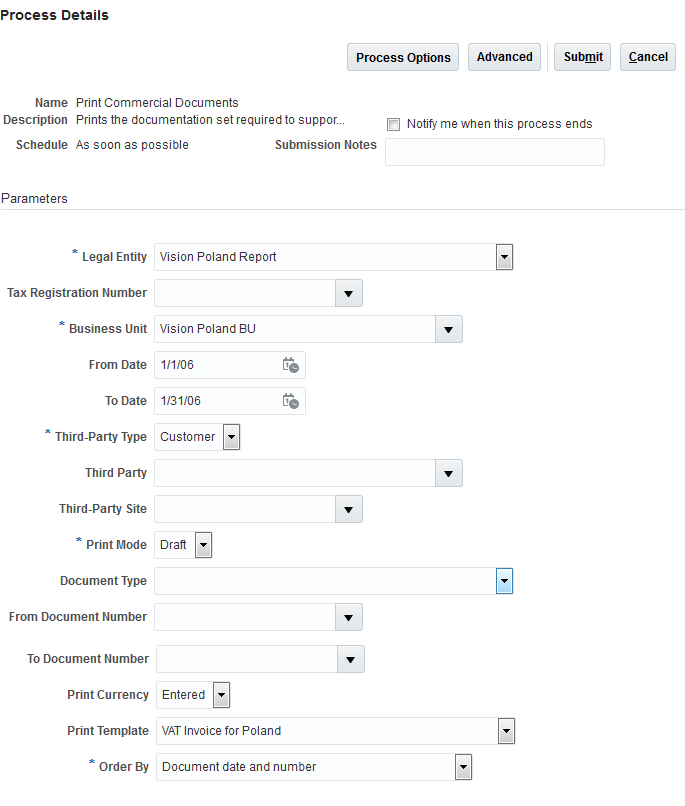 Set the Reporting Level parameter to Summary. To reprint an AR Tax Invoice that has already been generated, enter the Tax Invoice Number, and set the Reprint parameter flag to Y so that the exact information from the previous print will be reproduced. Select N to indicate adjustments to the parameters.