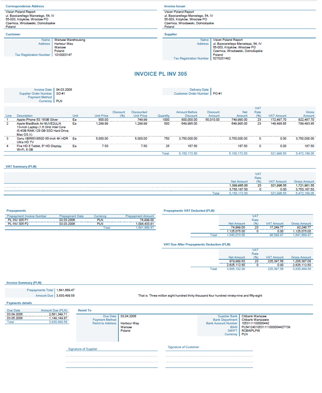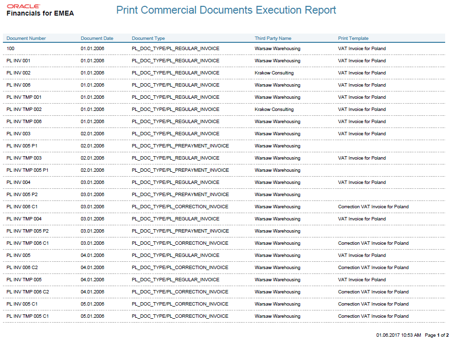These reports provide output in paper format for summary of invoices by customers and suppliers. The report shows the summary for electronic invoices and itemization of non-electronic invoices.