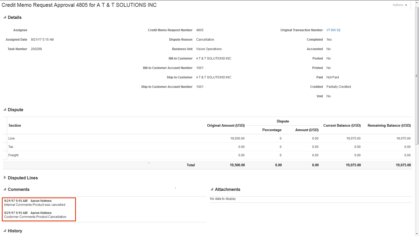 - Record the dispute details, including the credit memo request number, dispute amount, credit memo reason, and internal comments in the original transaction notes.
