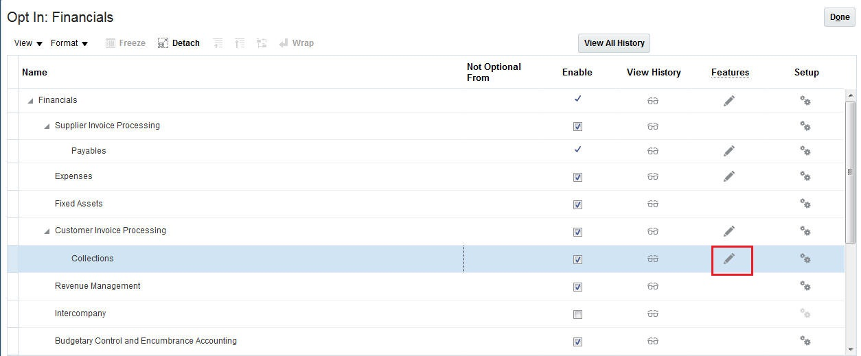 - On the Edit Features page, select the Enable option for any feature you want to opt in to. If the Enable column includes an Edit icon instead of a check box, then click the icon, select your feature options, and click Save and Close.