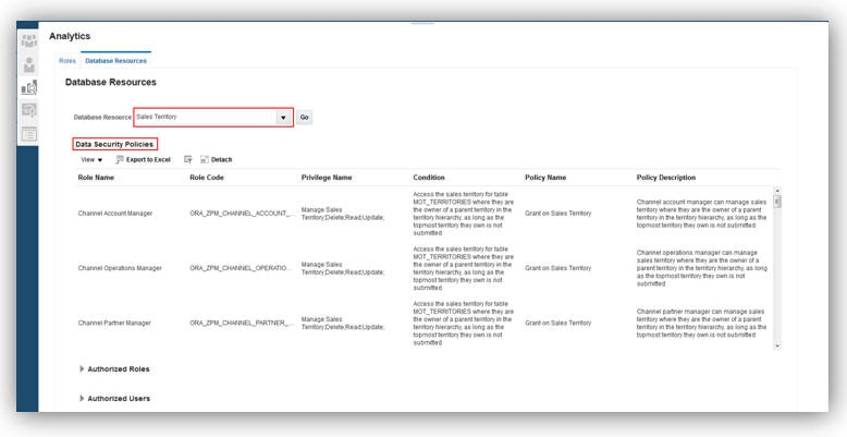 You can analyze data security policies by database resource. You can view the roles that are authorized to the database resource and the users that are authorized to the database resource. You can export the information displayed in the tables.