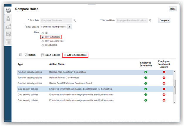 You can copy function and data security policies from the first role to the second role during role comparison. You can export the data displayed in the role comparison results table.