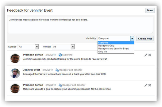 You can create feedback for yourself or any other person to whom you have data security access. You can edit and delete feedback that you create. When you create a note, you set the visibility to one of the following: