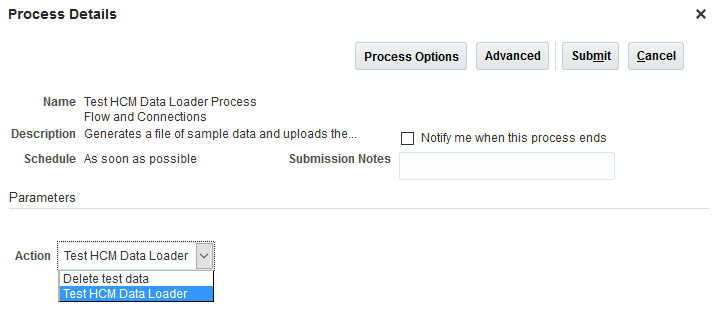 - A new process, Test HCM Data Loader Process Flow and Connections, which you run in the Scheduled Processes work area