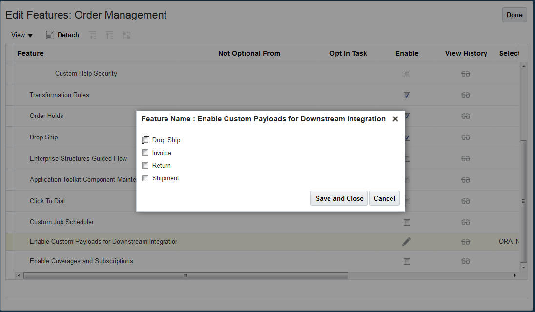 - On the Edit Features page, select the Enable option for any feature you want to opt in to. If the Enable column includes an Edit icon instead of a check box, then click the icon, select your feature options, and click Save and Close.