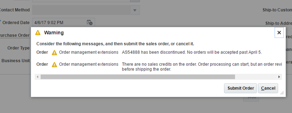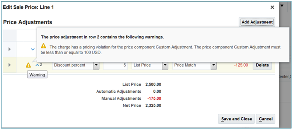 You can define pricing guidelines for price components such as Net Price, Manual Price Adjustment, and Margin. For example, you can set a guideline that the margin on order needs to be above 20%. The guideline rules associated with the pricing strategy are evaluated when the order is validated. For any guidelines that are violated, you are provided with the appropriate warnings based on the type of violation: error, information only, or warning. If authorized, you can override the exceptions and submit the order for further processing.