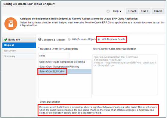 Subscription to the Sales Order Notification business event requires you to enable the relevant event triggering points using the Manage Business Event Trigger Points task as shown in the below screen capture: