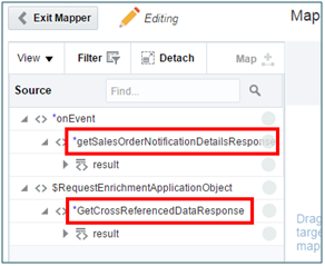 Map the Sales Order Notification event to your target system. Here you can map data elements from both the output of the Sales Order Notification event as well as the response of the GetCrossReferenceData operation. The following screenshot shows the source side of the mapping illustrating this: