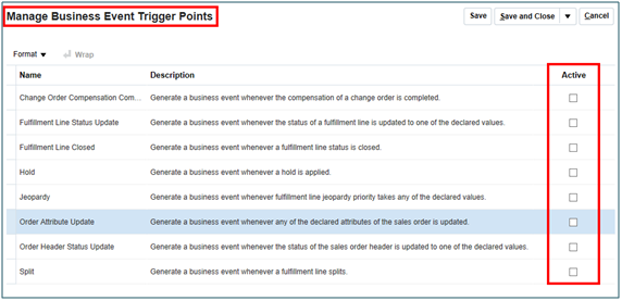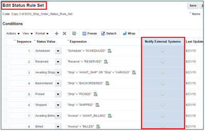 The fulfillment line-level status values, for which you would like to receive a business event notification, are enabled via the Manage Orchestration Process Definitions task. Here you would search and select the appropriate orchestration process and choose the Edit action. In the Process Details region, select the Status Conditions tab and the Fulfillment Line Status Values subtab. Next, click the Edit Status Rule Set button to bring up the setup page shown below. Check the Notify External Systems checkbox for the appropriate fulfillment line status values for which you would like to generate an event notification, as shown in the following screen capture: