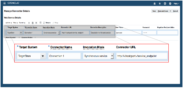 - Ensure that your web service has been set up in the Manage External Service Details for Algorithms task in the Setup and Maintenance work area. You can register as many services as needed and invoke them in the pricing algorithms using their connector name. When registering a web service, you must provide at least the target system, a name, an invocation mode (synchronous), and the actual connection URL for the service. Optionally, you can provide a brief description as well as authentication credentials if the service is secured.