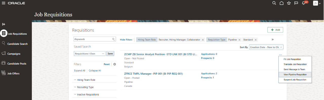 - For details on managing job requisition templates, refer to Chapter 6, “Job Requisition Templates” of the Implementing Recruiting guide in the Oracle Help Center.