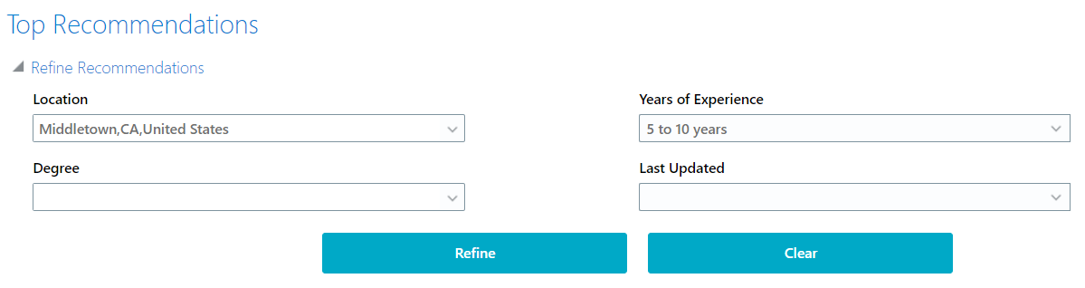 When the feature is enabled, you can see the Top Recommendations section in job requisitions. Candidates are sorted in order of recommendations, and you can refine the list of recommended candidates to review or decide who to invite to apply for a job. In addition, you can sort the job applications based on the AI recommendations.