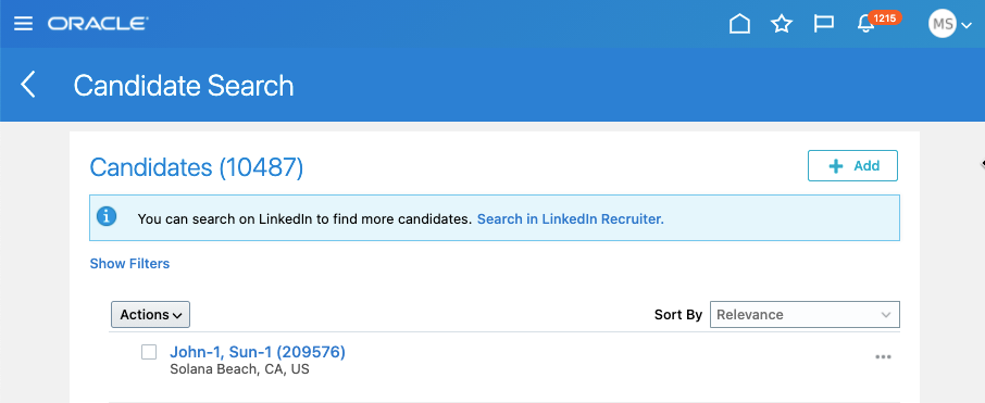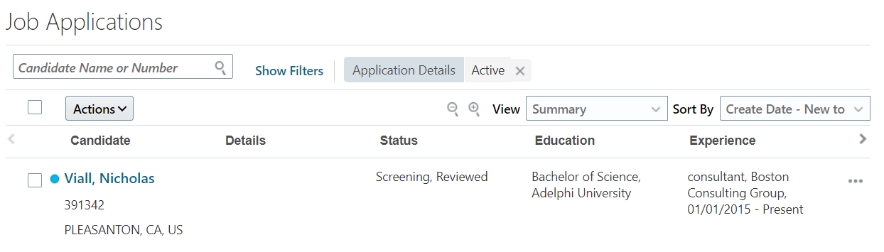 Search the job application list with enhanced filtering capabilities like the new skills and languages filters using Oracle Search. Oracle Search is a dedicated search platform for Oracle Cloud that provides a faster search experience. |