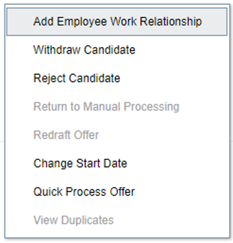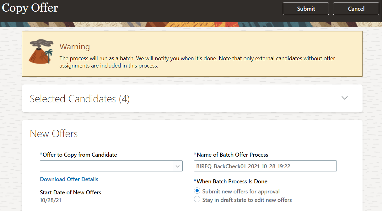 - Fastest way for HR specialists to transform internal candidates with job offers into their new assignments. HR specialists can process candidates earlier, they don’t have to wait for the automatic processing date to arrive for each candidate.