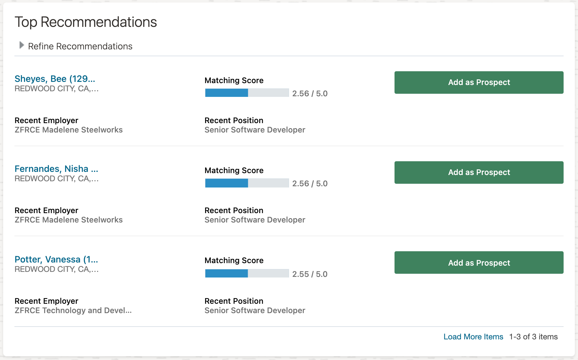 When you view the top recommendations for a job requisition or view the list of similar candidates for a specific candidate, you can now view a matching score relative to the candidates recommended.