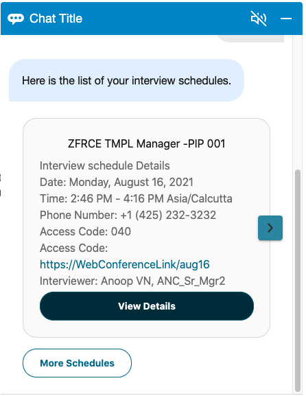 Candidates need to sign in to view their interview schedules. The response displays details such as the title, date, and time of the interview, along with a View Details link. Candidates can click this link to view additional details on the Candidate Experience page.