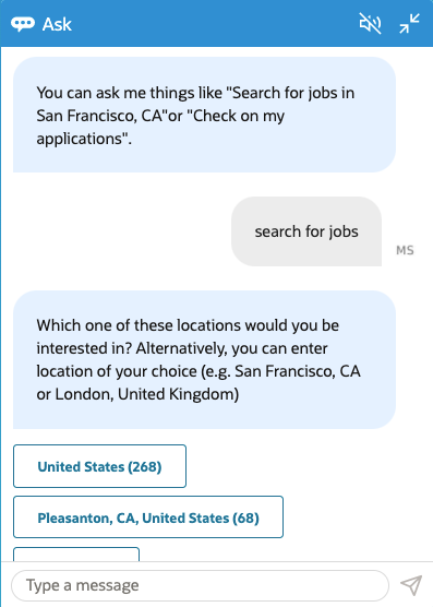 The enhanced Internal Candidate Experience skill now shows suggested locations and job categories to internal candidates when they search for jobs. This helps them select a job location and job category without having to enter related keywords in their utterances, even though they can still search with keywords.