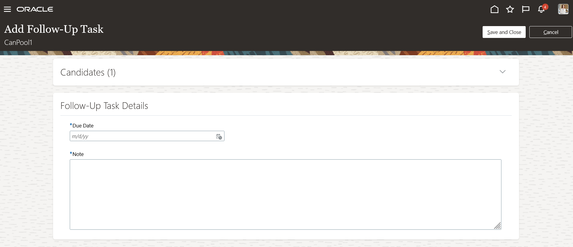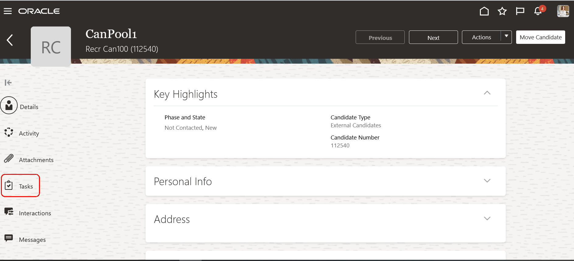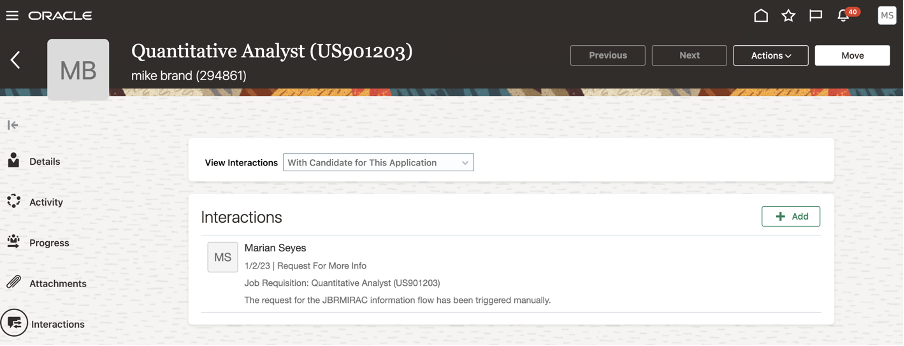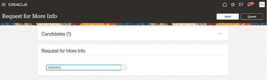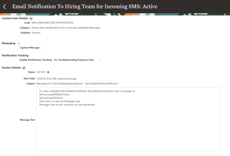 You can enable two-way communication for external candidates, internal candidates, or both. This allows Recruiting users to compose messages for candidates. When you don’t enable the two-way communication, a worklist notification is sent to candidates.