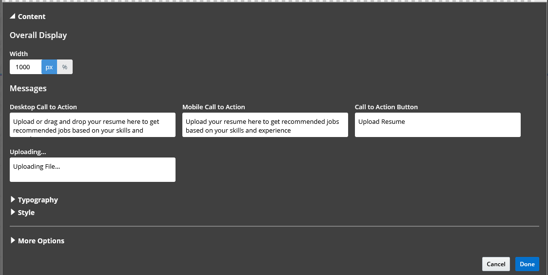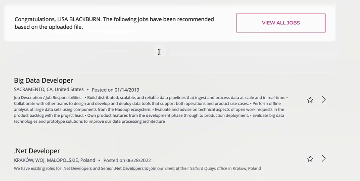Allow candidates to upload their resumes, and receive a recommended jobs list that is weighted and tailored for their current job title, location, and skills. Candidates can either drag-and-drop their resumes to the new widget, or they can click Upload Resume.