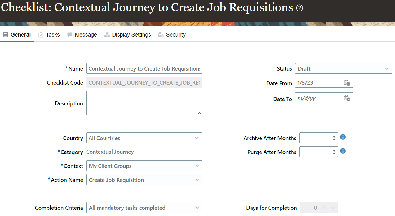 You configure the job application flow using the Job Application Flow Configuration task in the Setup and Maintenance work area. You then add it to the job requisition using the Details > Configuration section in Recruiting.