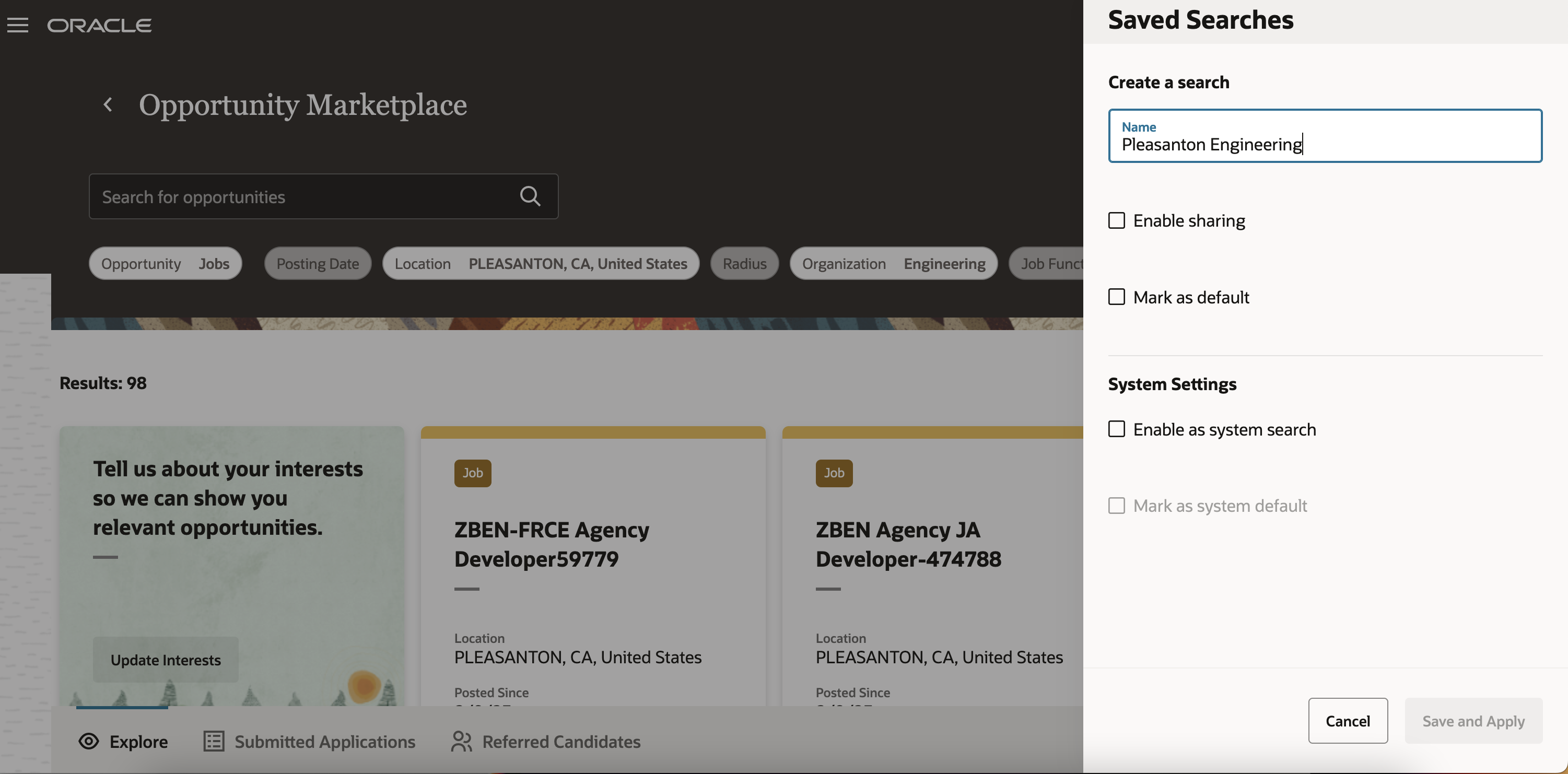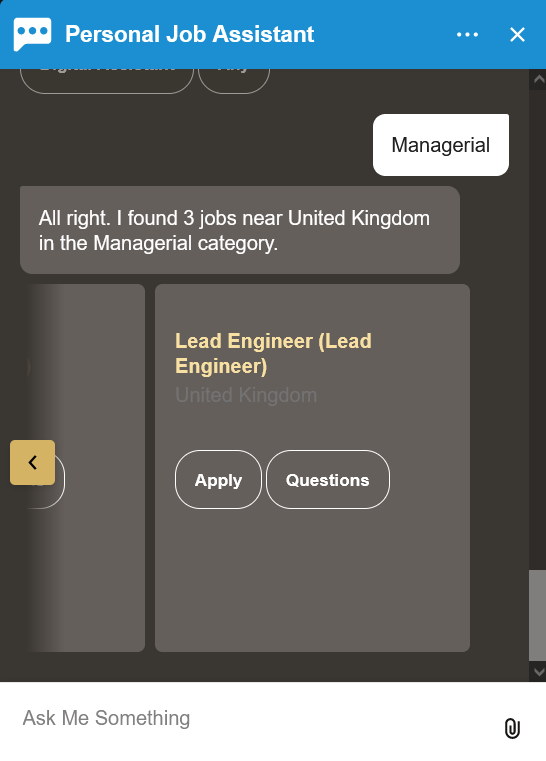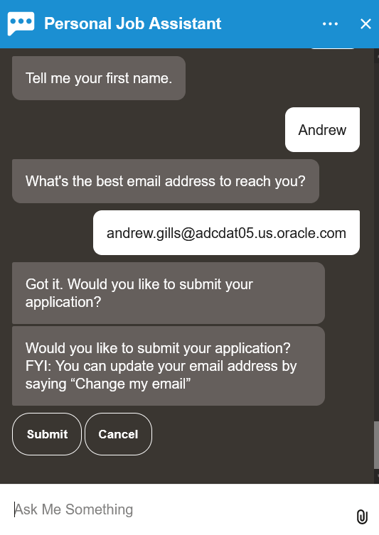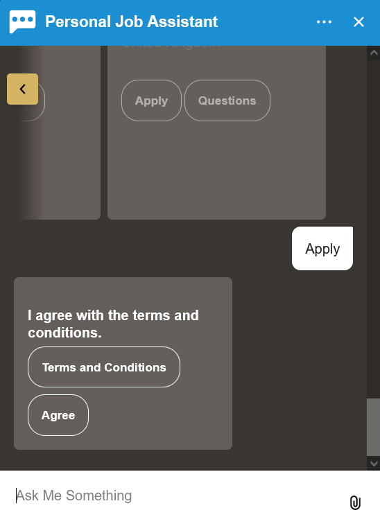 Take advantage of the enhanced features in the CEV2 skill in ORA by opting in to Recruiting Booster. This helps candidates get a seamless experience on the job search, get answers to job-related questions, and apply to the job quickly from the chat bot interface.