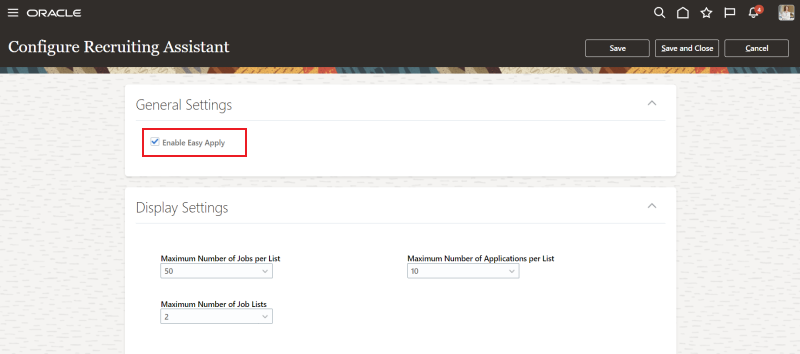 - On the Configure Recruiting Assistant page, select or clear Enable Easy Apply.