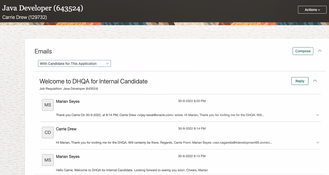 Recruiters and the hiring team can have conversations with internal candidates using Two-Way Communication using email. This is an extension of the two-way communication functionality already available for external candidates. The rules that are applied to external candidates are now applied to internal candidates. Note that if the internal candidate doesn’t have a work email, the alternate email is automatically used.
