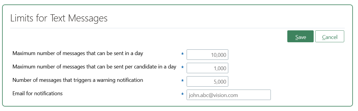 To limit the volume of outbound text messages, you need to configure the maximum number of text messages that can be sent in a day and the maximum number of text messages that can be sent per candidate in a day. When the limit you enter is reached, outbound messages to the service provider are blocked and a warning notification is sent to the email address entered in the option Email for notifications.